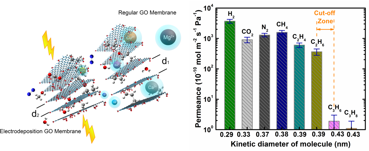 曾高峰研究团队在前期工作(Chem Commu, 2015, 51, 7345; RSC Adv, 2014, 4, 52012)的基础上开发并验证了一种在多孔不锈钢中空纤维上电沉积快速制备超薄氧化石墨烯复合膜的方法,既可以有效缩小二维层间距又增强了膜的机械性能。在环形电场作用下,氧化石墨烯第一时间在对电极上发上部分电还原,再经静电力有助于沉积在工作电极不锈钢中空纤维表面,形成超薄均匀的氧化石墨烯膜。顺利获得电还原能够在一定范围内控制氧化石墨烯的二维层间距,从而能够适用于特定的分离体系。研究发现,在优化的沉积条件下所得的氧化石墨烯复合膜能够精确筛分尺寸非常接近的C2(乙烷和乙烯)和C3(丙烷和丙烯)烃类分子(图1),C2/C3的理想选择性达到190-550。而C2和C3烃类分离在天然气纯化、甲醇制烯烃(MTO)和费托合成烯烃(FTO)等工业过程中具有现实的分离需求。此外,电沉积氧化石墨烯复合膜在醇类脱水和海水脱盐的液相分离中也表现出了极高的选择分离性能,能够高效筛分最小的醇分子和离子。