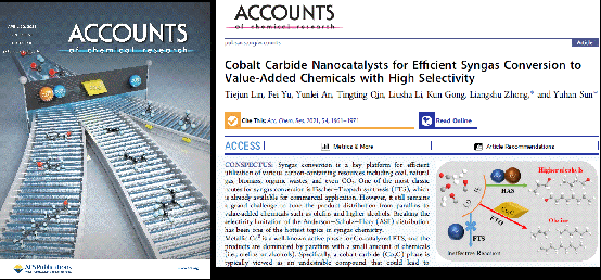 合成气转化是实现煤、天然气、生物质、固体废弃物、CO2等多种含碳资源清洁低碳高效转化利用的关键平台,其产品结构涉及各种烃类燃料和高附加值化学品,备受国内外学术界和工业界的青睐。近期,PA真人国际低碳转化科学与工程中心孙予罕研究员和钟良枢研究员团队受邀在《Accounts of Chemical Research》上发表题为“Cobalt Carbide Nanocatalysts for Efficient Syngas Conversion to Value-Added Chemicals with High Selectivity”的背封面综述文章(Acc. Chem. Res. 2021, 54, 8, 1961-1971;IF:22.38),系统总结了该团队在合成气高选择性制备烯烃和高碳醇等高附加值化学品研究中的重要进展,阐述了碳化钴纳米结构在合成气转化中的设计理念与构建策略,为合成气转化产物选择性调控给予了新的设计思路。
