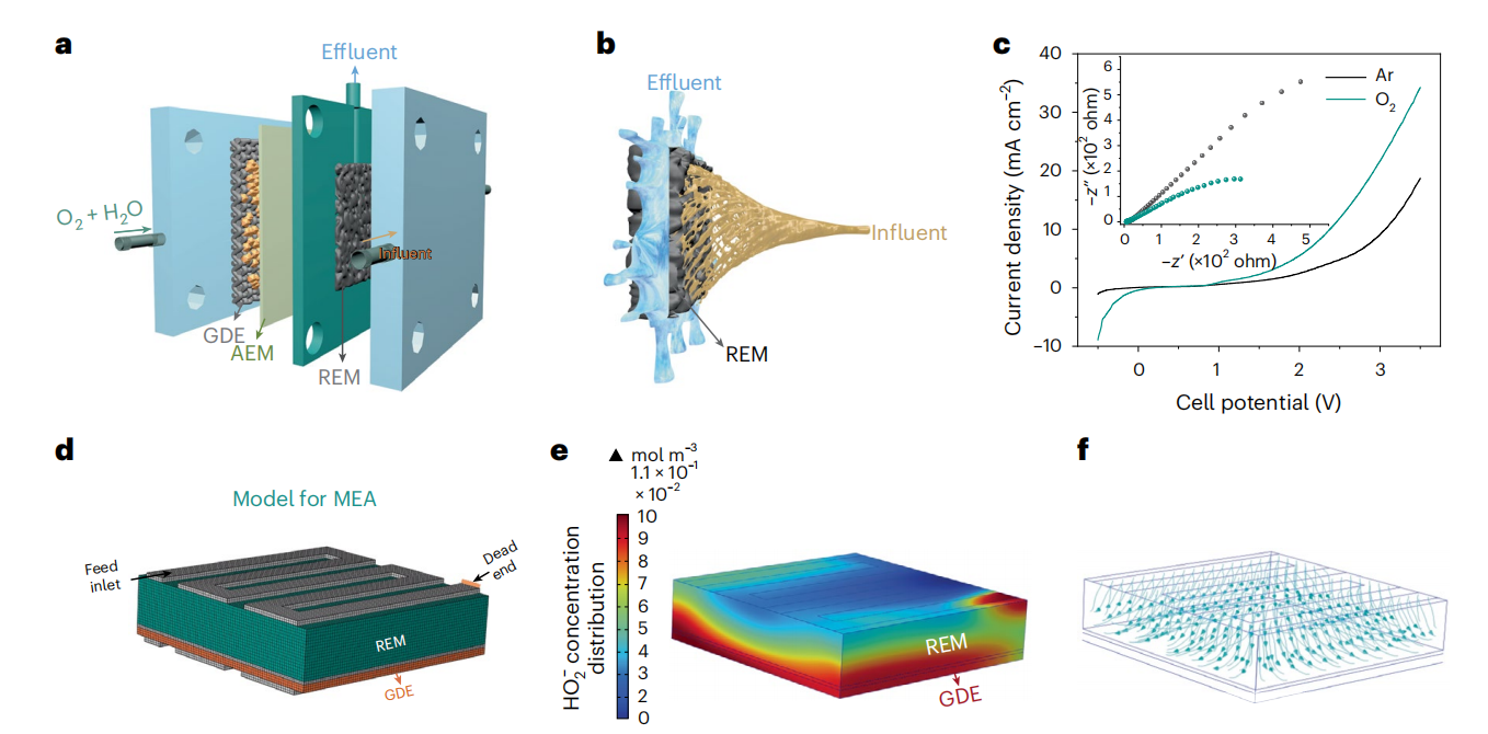 针对这一问题,研究团队创新性地将气体扩散电极与电化学活性膜电极相结合,组装了膜电极组件(MEA)水处理系统,实现了阴极氧还原反应和阳极氧化反应的耦合增效。中国科研实验室上海高等研究院的研究团队在本工作中,特别是在理论计算与模拟方面给予了关键支撑。顺利获得多物理场模拟,清晰揭示了MEA系统中电位分布、活性物质浓度场(如HO₂⁻和·OH)及流体压力场的变化规律,从理论上阐明了该装置相对于传统流动池反应器(FCR)在传质效率、反应动力学和电流密度方面的优越性,为器件设计与性能优化给予了重要理论依据。