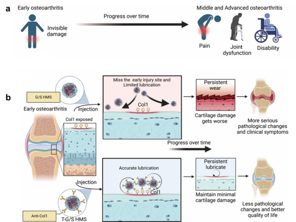 骨关节炎(OA)是一种退行性骨关节疾病,会导致疼痛、功能障碍和永久性关节损伤,并且现在病情开展被认为是不可逆的。因此,在OA早期进行及时治疗并延缓其进一步开展具有重要意义。OA的重要病因之一是关节间润滑缺失,然而由于OA早期病灶微小,现有的生物润滑剂难以精准地靶向小面...