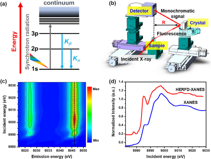 图1 (a)K?和K?发射谱线产生能量机制图;(b)上海光源BL14W1-XAFS线站搭建的von Hamos构型谱仪设计图;(c)CuO的Kα RIXS谱以及(d)顺利获得对Kα1积分取得的HERFD-XANES与传统XANES对比。