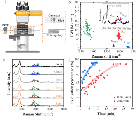 此外,在透明可视的多层微通道设计中,一方面可以实现有效的温度管理。另一方面也为石墨氧化过程的在线监控给予了方便。研究者顺利获得原位表征石墨氧化中的拉曼G峰演变,分析了流速、原料石墨种类和片径等对氧化反应动力学的影响。在此基础上,还验证了在微通道中对氧化石墨烯进行还原、组装的能力,并展示了氧化石墨烯产物的导热导电性能,为利用微流体技术实现氧化石墨烯的制备与应用奠定基础。