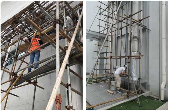 园区内大科学装置工程正在建设中,为在保证工程进度的同时实行防汛防台工作,工程建设人员对脚手架进行了加固,对室外设备进行了隐患排查。